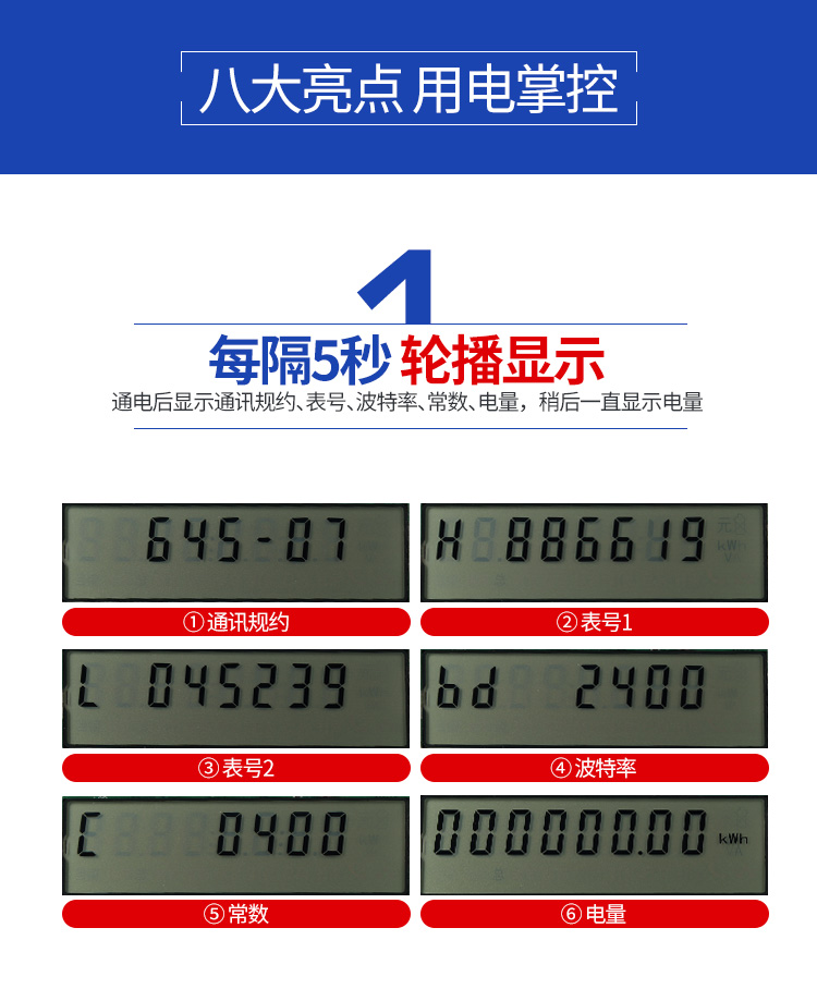 5.顯示功能 :采用寬溫大液晶方式顯示各類信息;電能量顯示位數為6為整數,2為小數,具有參數自動輪顯功能。
