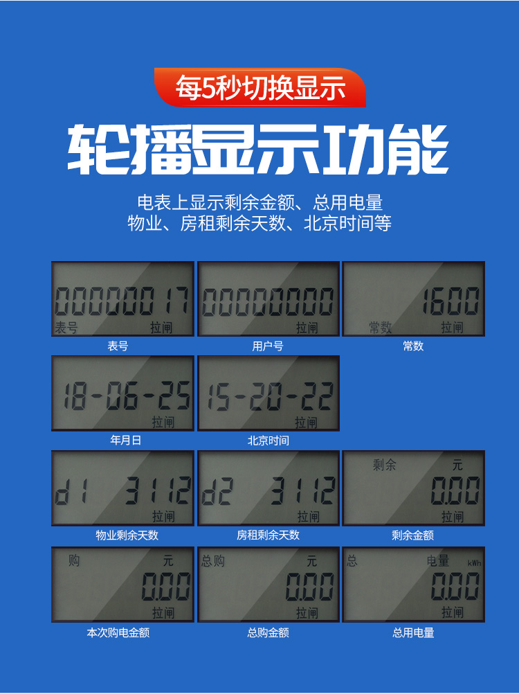 15、 故障申報:剩余電量顯示為零或負值時,顯示“拉閘”提示符,如電表仍繼續運行,用戶應立即購電,并主動向供電部門反映情況。